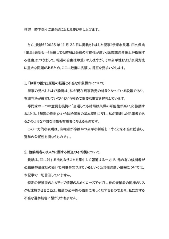 田久保氏が選挙前の中傷記事「当選しても失脚」に抗議、他候補の刑事···